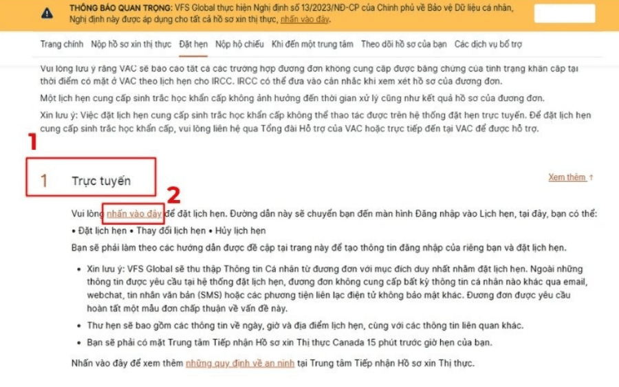 Sau khi hoàn tất tờ khai xin visa Canada, bạn truy cập vào trang web chính thức của VFS Global tại địa chỉ https://visa.vfsglobal.com/vnm/vi/can/book-an-appointment. Tại đây, ở mục “Trực tuyến”, bạn chọn “nhấn vào đây” để bắt đầu đặt lịch hẹn nộp hồ sơ.