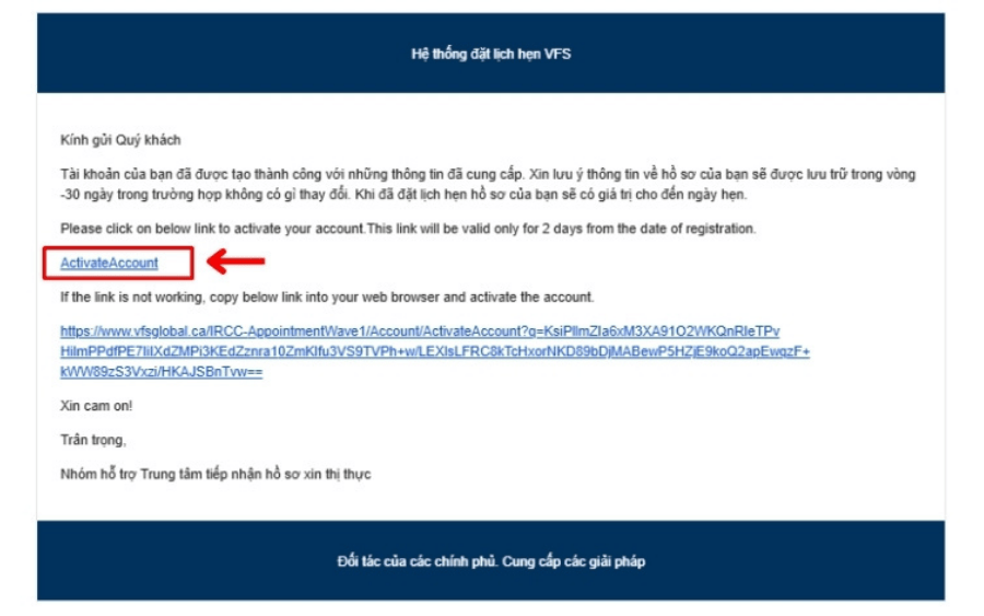 Sau khi đặt lịch hẹn thành công, bạn sẽ nhận được email xác nhận lịch hẹn gửi đến địa chỉ email đã đăng ký. Hãy in hoặc lưu lại email này, vì đây là giấy tờ bắt buộc cần mang theo khi đến nộp hồ sơ tại VFS Global.