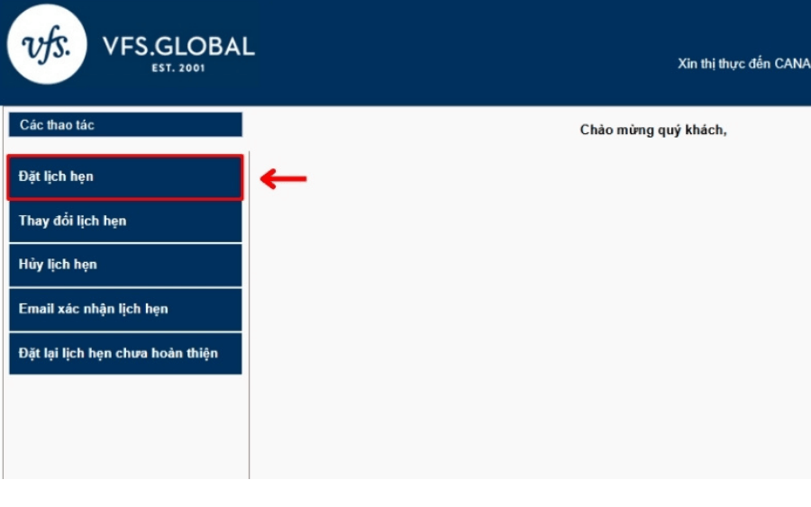 Khi đăng nhập thành công, hãy truy cập vào mục “Đặt lịch hẹn” để tiếp tục quy trình.