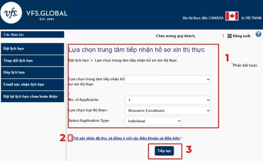 Để hoàn tất hồ sơ xin visa Canada, việc đặt lịch hẹn nộp hồ sơ tại trung tâm tiếp nhận là bước bắt buộc và quan trọng. Bạn có thể dễ dàng thực hiện thao tác này trực tuyến theo hướng dẫn chi tiết dưới đây