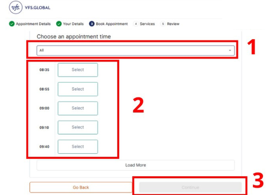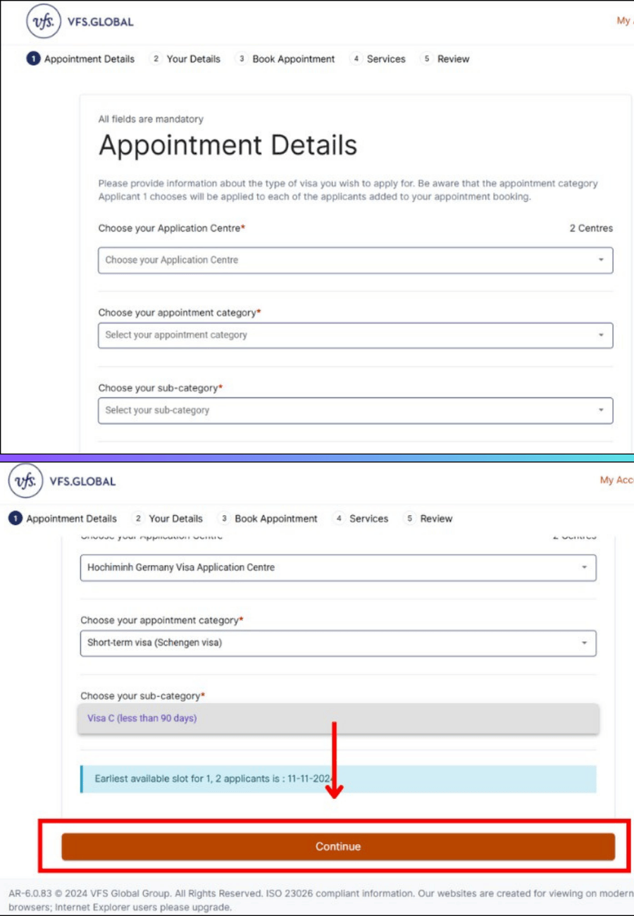 - Bạn cần cung cấp đầy đủ các thông tin theo yêu cầu của VFS, bao gồm thông tin cá nhân, chi tiết chuyến đi và thời gian lịch hẹn mà bạn mong muốn.