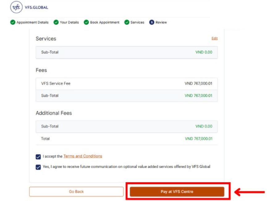- Ở bước cuối, hãy rà soát lại toàn bộ thông tin, thời gian và dịch vụ đã chọn, rồi xác nhận bằng cách nhấn Pay at VFS centre.