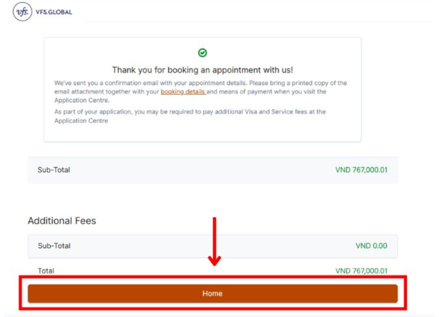 - Nếu bạn muốn đặt lịch xin visa theo nhóm, mỗi thành viên đều phải tự có lịch hẹn visa riêng. Trường hợp cần thêm lịch hẹn, hãy nhấn Home để tiếp tục thao tác.
