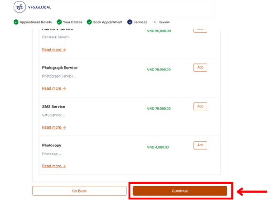 - Chọn thêm loại dịch vụ đi kèm nếu cần và nhấn Continue để tiếp tục.