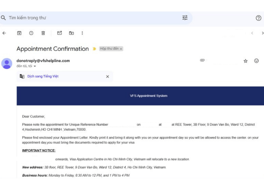 Sau khi hoàn tất đặt lịch, bạn sẽ nhận được email xác nhận chi tiết cuộc hẹn visa Đức.