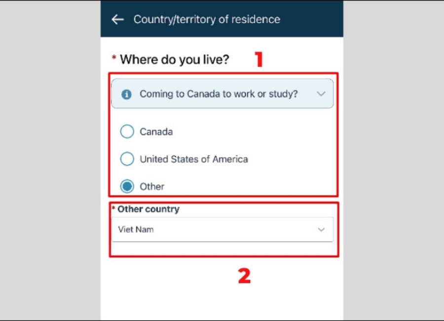 Mục Where do you live? Bạn chọn quốc gia nơi bạn đang cư trú. Trường hợp bạn đến Canada để học tập hoặc làm việc, có thể nhấn vào mũi tên bên cạnh “Coming to Canada to work or study?” để xem và bổ sung thông tin liên quan.