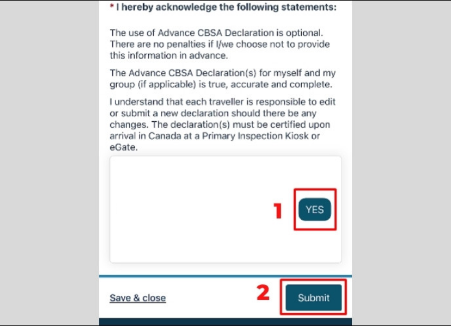 Sau khi hoàn tất toàn bộ phần khai báo, ứng dụng sẽ chuyển bạn đến màn hình xác nhận thông tin cuối cùng. Ứng dụng sẽ hiển thị mục Important information: Your responsibility. Bạn cần xác nhận rằng toàn bộ thông tin khai báo là chính xác và chịu trách nhiệm theo luật Canada nếu cung cấp sai hoặc thiếu thông tin.