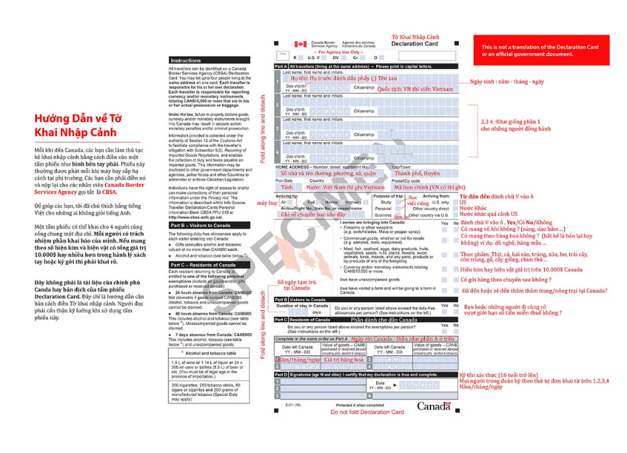 - Value of goods – CAN$ purchased or received abroad (including gifts, alcohol & tobacco): Khai tổng giá trị hàng hóa mang vào Canada (bao gồm quà tặng, rượu bia, thuốc lá) tính bằng đô la Canada (CAD). Trường hợp đi theo nhóm, ghi giá trị tương ứng cho từng người theo đúng thứ tự. Nếu giá trị vượt mức quy định, bạn có thể phải nộp thuế hoặc bị xử phạt theo quy định hải quan.