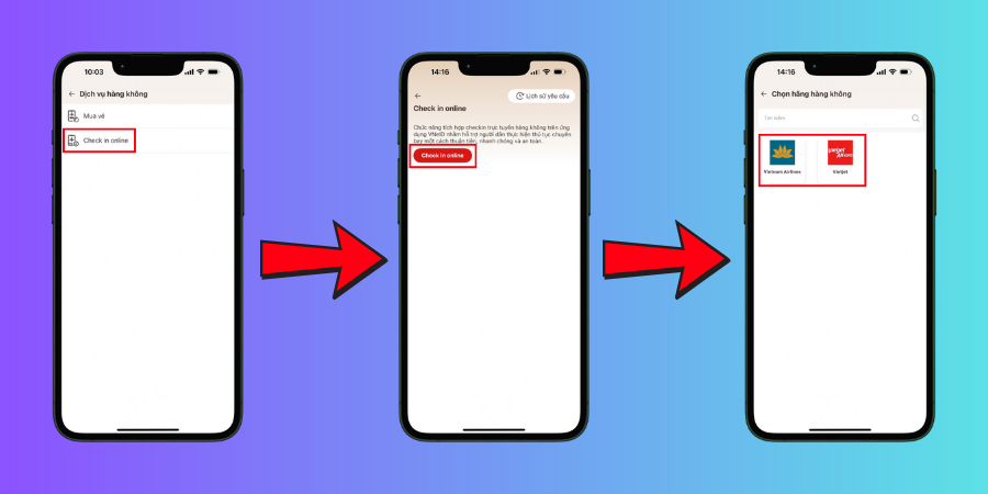•  Chọn mục “Check in online”, nhấn nút “Check in online” và chọn hãng hàng không phù hợp
