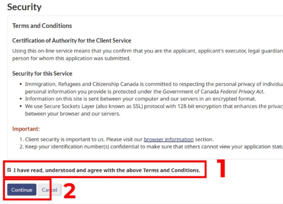 Bước 1: Truy cập vào đường dẫn https://services3.cic.gc.ca/ecas/security.do?lang=en. Sau đó, chọn đồng ý với các điều khoản sử dụng và nhấn Continue để tiếp tục.